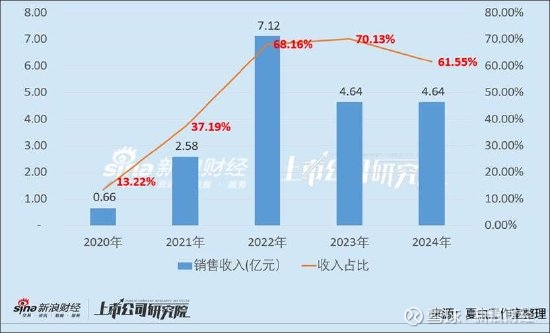 我们进一步发现,公司上市后,公司出现对汉朔科技股份有限公司变得极为依赖,且销售金额出现剧烈波动。2020年至2024年,公司对汉朔科技的销售额分别为0.66亿元、2.58亿元、7.12亿元、4.64亿元、4.64亿元,销售额占比分别为13.22%、37.19%、68.16%、70.13%、61.55%。可以看出,公司上市前,其与汉朔科技交易金额占整体收入之比在50%,上市后销售额占比最高飙涨至70.13%。