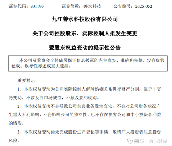 11月7日晚间,善水科技(SZ301190)发布公告称,公司收到实际控制人的通知,获悉经法院调解,黄国荣和吴新艳双方已解除婚姻关系,并就股份分割等事宜做出相关安排。