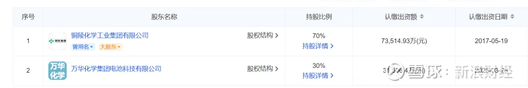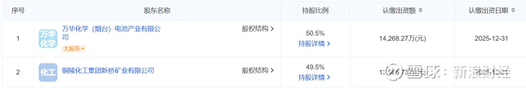 而铜陵化工集团新桥矿业有限公司也是由铜陵化学工业集团有限公司和万华化学集团电池科技有限公司(持股30%)合资成立。
