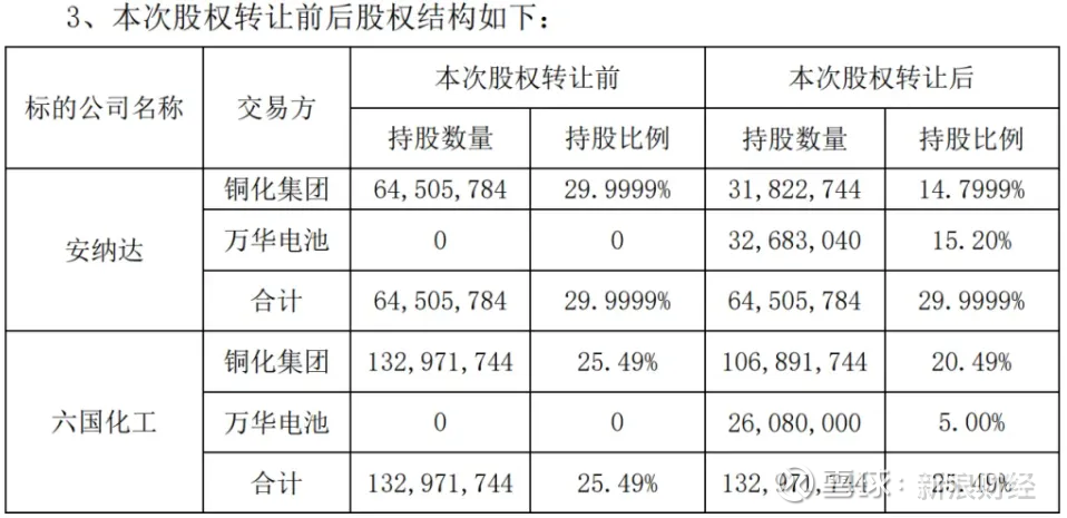 但到了2024年2月,该收购在金额及收购主体上均发生了变动:万华化学将通过其全资子公司万华电池直接受让安纳达及六国化工的部分股权,交易总金额也降至约4.15亿元。