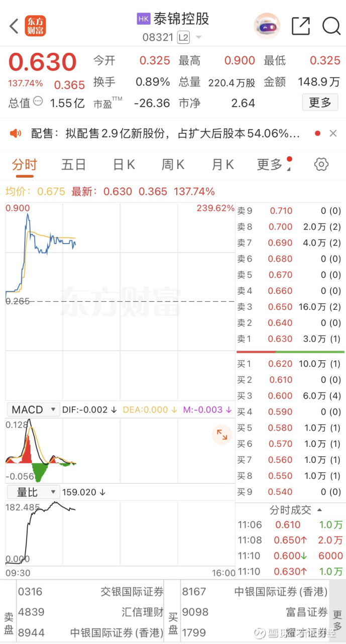 上证报中国证券网讯(记者 杨子晏)11月10日,泰锦控股开盘后股价一路走高,盘中涨超200%,最高股价一度冲高至0.9港元/股。截至11时11分,泰锦控股报0.63港元/股,涨幅137.74%。