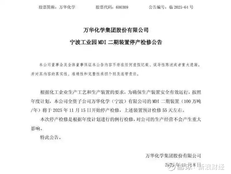 慧正资讯,11月7日,万华化学公告称,公司全资子公司万华化学(宁波)有限公司的MDI二期装置(100万吨/年)将于2025年11月15日开始停产检修,预计检修55天左右。此次停产检修为年度计划内的例行检修,对公司生产经营不会产生重大影响。作为全球MDI产能占比近30%的行业龙头,万华(宁波)装置停产检修55天,将减少市场供应,这无疑进一步强化价格涨价预期。