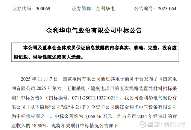 山西A股上市公司金利华电(300069.SZ)11月7日发布重磅公告,公司全资子公司浙江金利华电气设备有限公司成功中标国家电网有限公司2025年第六十五批采购项目,中标金额约5068.46万元。