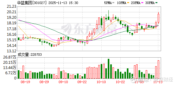 交易行情显示,11月13日,华蓝集团收涨8.59%,收于19.85元/股,总市值29.18亿元。