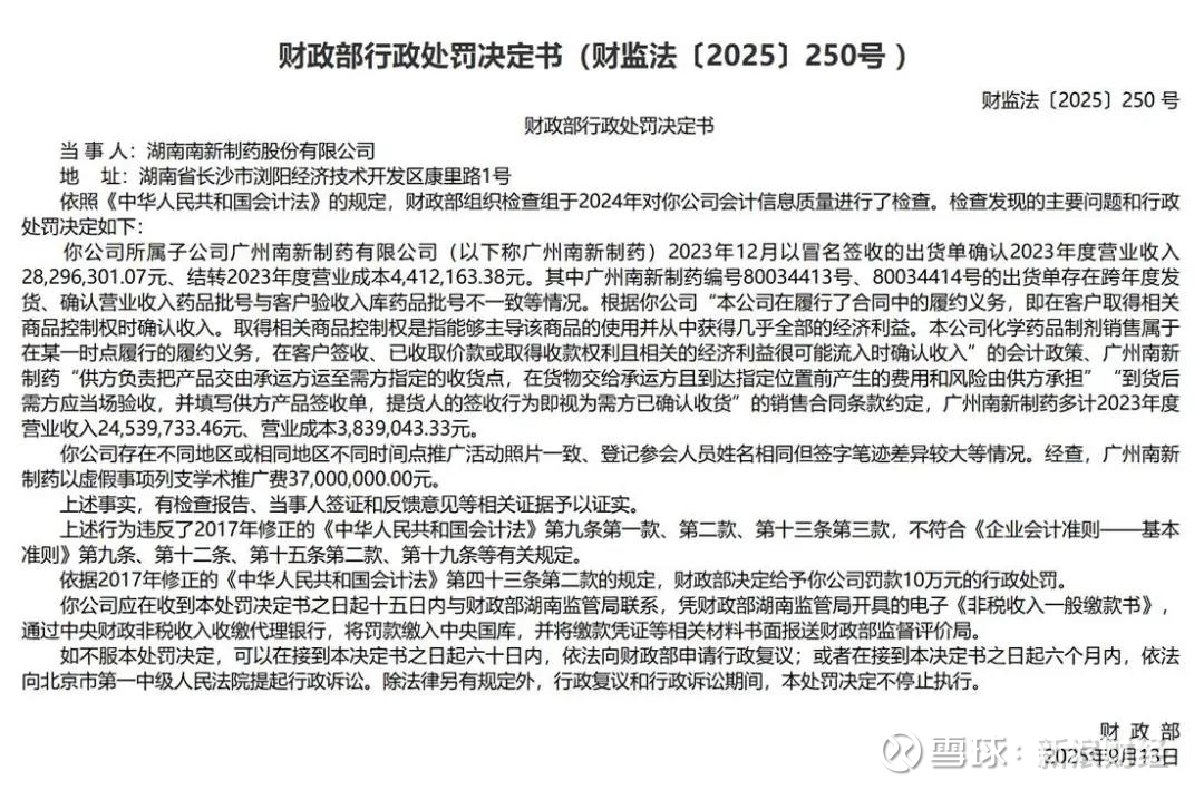 作者注意到,9月13日,财政部对南新制药下发的行政处罚决定书恰好与上述会计更正差错所涉数额吻合。财监法[2025]250号显示,南新制药所属子公司广州南新制药有限公司(下称“广州南新”)在2023年12月以冒名签收的出货单确认2023年度营业收入2829.63万元、结转2023年度营业成本441.22万元。广州南新的出货单存在跨年度发货、确认营业收入药品批号与客户验收入库药品批号不一致等情况。广州南新多计2023年度营业收入2453.97万元、营业成本383.9万元。