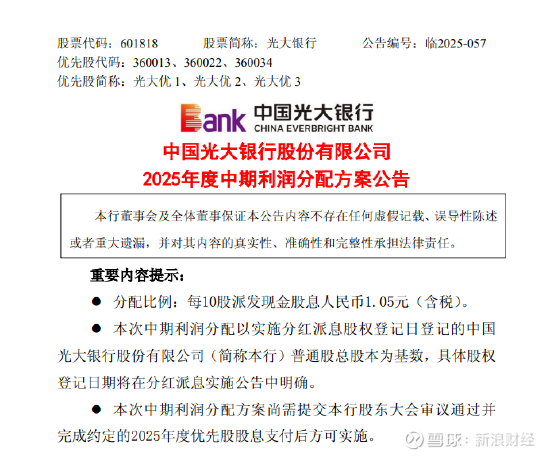 11月14日金融一线消息,光大银行发布2025年度中期利润分配方案公告,公司拟向全体普通股股东每10股派发现金股息1.05元(含税),预计总派发金额为62.04亿元。本次中期利润分配方案尚需提交该行股东大会审议通过并完成约定的2025年度优先股股息支付后方可实施。