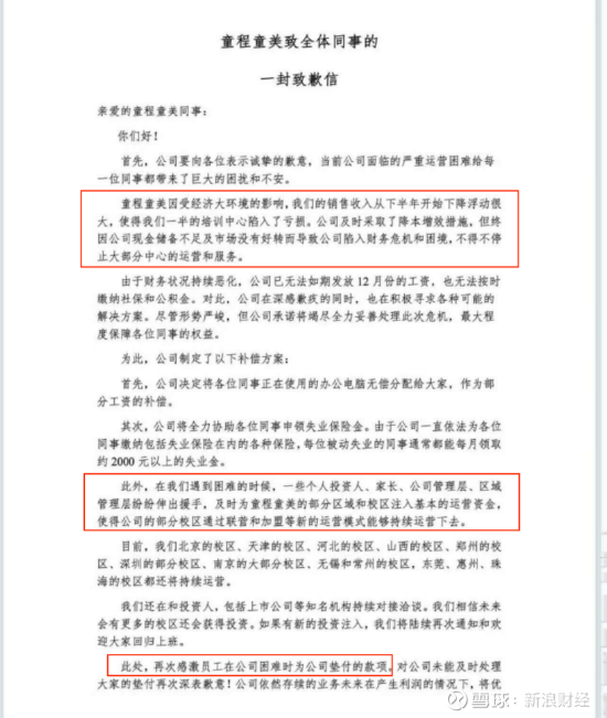 李腾提供的一份童程童美全员致歉信显示,在童程童美多地门店爆发“一夜跑路”情况前后,公司确实曾出现部分区域管理层及员工垫资的情况,这也意味着,一些门店对应的利润分配将与垫资人员的投入相匹配——部分门店被区域人员直接盘下并非毫无依据。