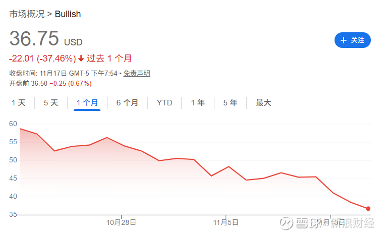 方舟最新的加仓行动发生之际,加密市场正发生剧烈震荡,Bullish公司股票在纽约证券交易所已经出现“三连阴”,周一收盘时跌幅达4.5%,报每股36.75美元,过去一个月更是下跌了37.46%。