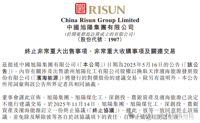 11月14日,滨海能源发布公告,公司原拟通过发行股份方式购买旭阳集团有限公司、邢台旭阳煤化工有限公司、深创投制造业转型升级新材料基金(有限合伙)、农银金融资产投资有限公司合计持有的沧州旭阳化工有限公司(以下简称沧州旭阳)100%股权。中国旭阳集团也发布了相关公告。