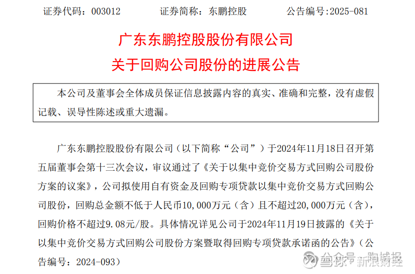 东鹏控股的股份回购计划始于2024年11月18日,根据该方案,公司拟使用自有资金及回购专项贷款,以集中竞价交易方式回购股份,回购总金额区间为不低于1亿元(含)且不超过2亿元(含),回购价格不超过9.08元/股。