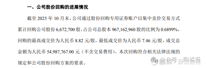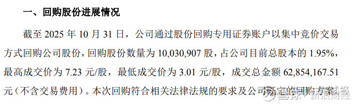 11月4日,帝欧水华发布股份回购进展公告,披露了截至2025年10月31日的股份回购实施情况。公告显示,公司已通过集中竞价交易方式累计回购股份1003.09万股,占总股本的1.95%,成交总金额约6285.42万元,回购价格区间为3.01元/股至7.23元/股。