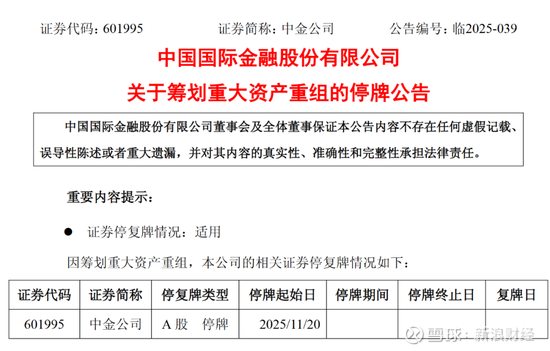 中金公司公告称,公司A股股票将于2025年11月20日(星期四)开市时起开始停牌。本次重组涉及到A+H股两地上市公司同时吸收合并两家A股上市公司,涉及事项较多、流程较为复杂,根据上海证券交易所的相关规定,预计停牌时间不超过25个交易日。