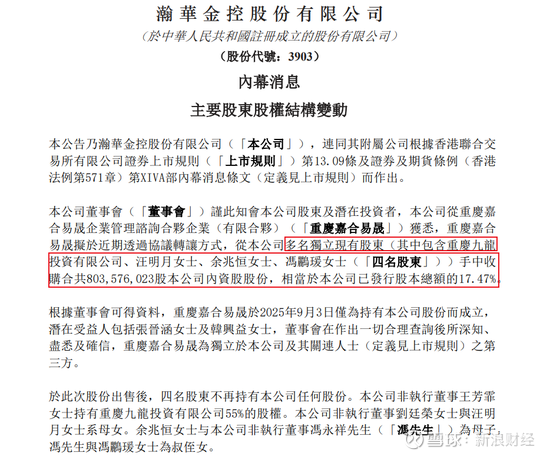 9月,重庆嘉合易晟企业管理咨询合伙企业(有限合伙)(下称“重庆嘉合易晟”)拟通过协议转让方式,从瀚华金控4名股东手中收购8.04亿股股份,占已发行股本的17.47%,成为第一大股东。