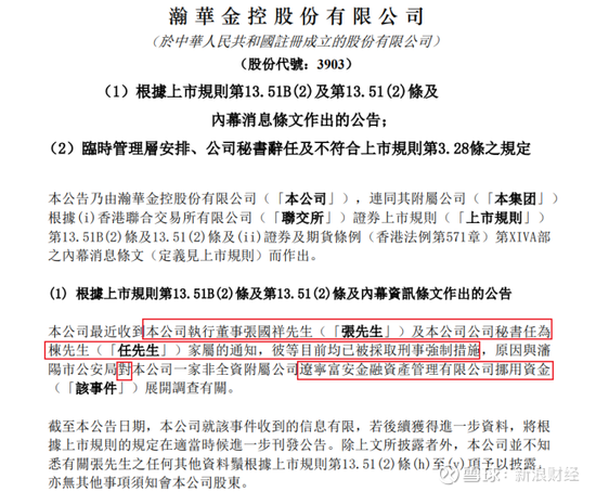 3月25日,根据瀚华金控公告,执行董事张国祥与公司秘书任为栋因涉嫌挪用资金,已被沈阳市公安局采取刑事强制措施。
