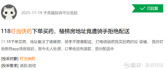 2025年11月,有消费者投诉称,在叮当快药下单后,因地址是楼梯房竟遭到骑手拒绝配送,骑手甚至声称要将其购买的药品“扔垃圾桶”。最终该订单无人处理,款项也未退还。