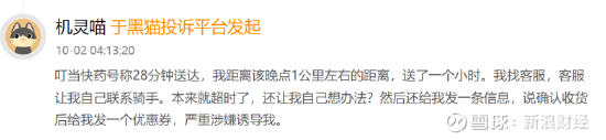 (资料来源:黑猫投诉) 连叮当健康主打的“28分钟到达”也成了投诉点,2025年10月,有消费者投诉其订单配送时长1小时,值得关注的是该配送药房距其住址仅1公里左右的距离。