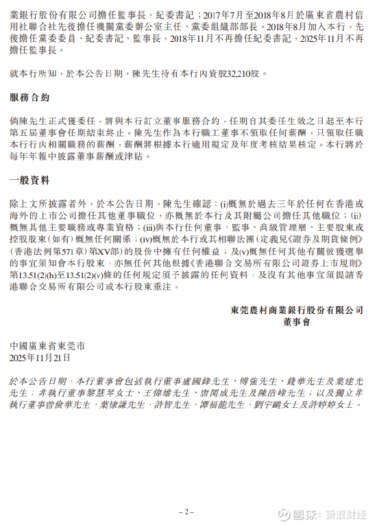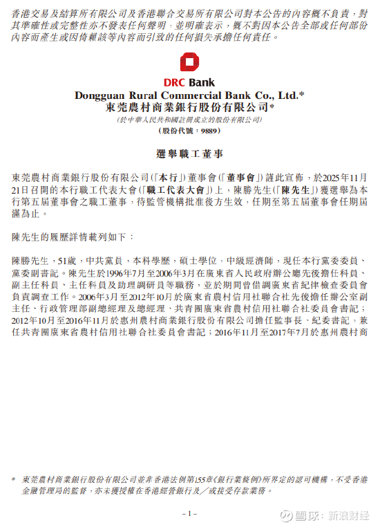 11月21日金融一线消息,东莞农商银行发布公告,于2025年11月21日召开的本行职工代表大会上,陈胜先生获选举为本行第五届董事会的职工董事,待监管机构批准后方生效,任期至第五届董事会任期届满为止。