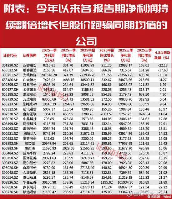 结合今年三季报业绩统计,剔除ST公司,沪深京三市有664家公司前三季度净利润盈利且同比翻倍增长,其中161家公司今年4月8日以来的累计涨幅低于同期表现最弱的沪综指,进一步统计发现,目前有27家公司,今年前三个报告期均持续盈利且净利润同比翻倍增长,但统计期内股价表现却弱于市场均值(见附表)。