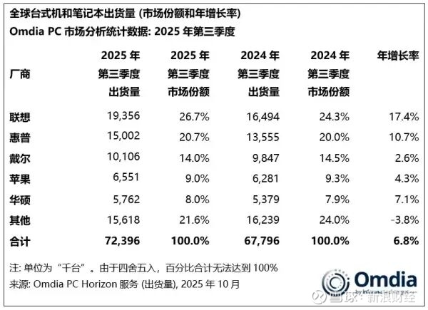 据咨询机构Omdia(原Canalys)公布的数据显示,2025年第三季度,台式机、笔记本及工作站的全球总出货量同比增长6.8%,达到7200万台。其中,笔记本(包括移动工作站)出货量增长4%,达到5720万台;台式机(包括台式工作站)出货量增长17%,达到1520万台。