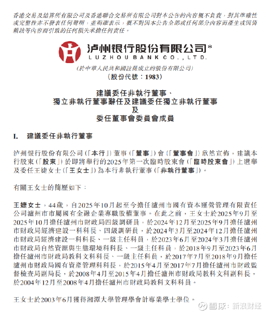 11月27日金融一线消息,泸州银行11月26日发布公告,宣布将于2025年股东会上选举及委任王婕为非执行董事。同时,董事会宣布,建议股东临时会股东会选举及委任邱伟为独立非执行董事。高晋康因个人工作调整,辞去独立非执行董事。