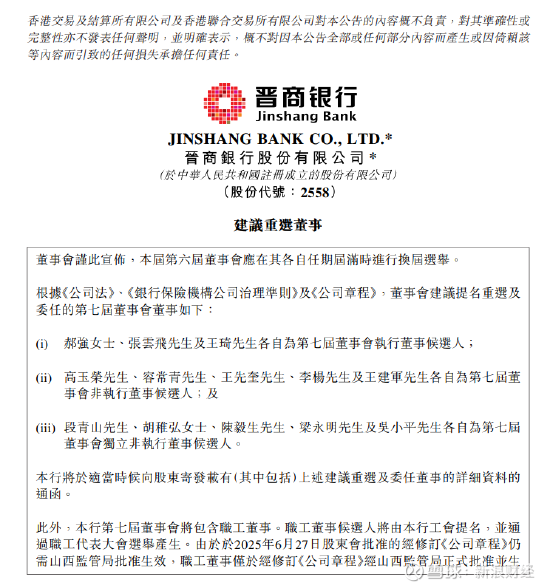 11月28日金融一线消息,晋商银行11月27日晚间发布公告称,本届第六届董事会应在其各自任期届满时进行换届选举。董事会建议在该行将于2025年12月19日举行的临时股东大会上重选及委任董事。根据《公司法》、《银行保险机构公司治理准则》及《公司章程》,董事会建议提名重选及委任的第七届董事会董事如下:(i)郝强女士、张云飞先生及王琦先生各自为第七届董事会执行董事候选人;(ii)高玉荣先生、容常青先生、王先奎先生、李杨先生及王建军先生各自为第七届董事会非执行董事候选人;及(iii)段青山先生、胡稚弘女士、陈毅生先生、梁永明先生及吴小平先生各自为第七届董事会独立非执行董事候选人。