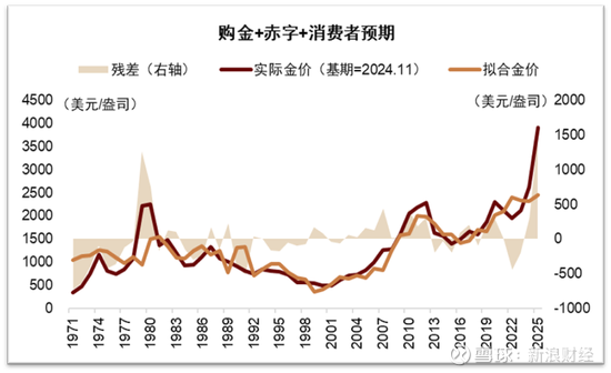 他发现实际金价的波动,也就是扣掉通胀的黄金价格,用三个因素可以解释绝大部分,全球央行对于黄金的购买或出售是最主要的解释变量,然后还有赤字和消费者信心。如果看这个模型可以发现,残差项达到了历史最高值,跟长期的几个因子所决定的金价相比,当前的金价已经明显高估。
