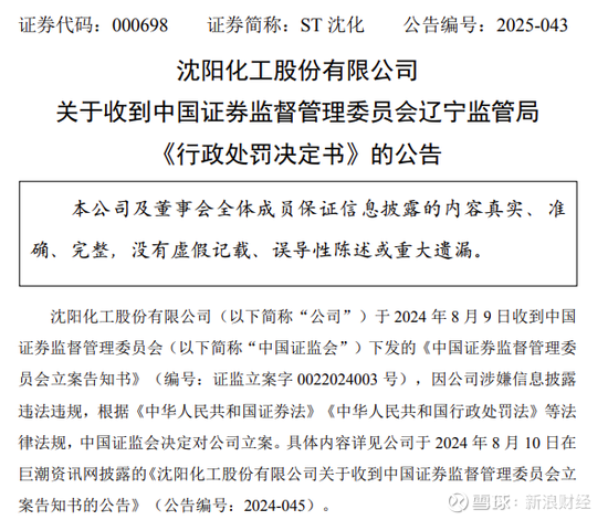 ST沈化(000698)11月28日晚间公告称,公司于2025年11月28日收到证监会辽宁监管局下发的《行政处罚决定书》(〔2025〕7号)。就公司在2018年至2021年期间的年报虚假记载情况,监管层对ST沈化(沈阳化工)以及相关责任人进行了处罚。