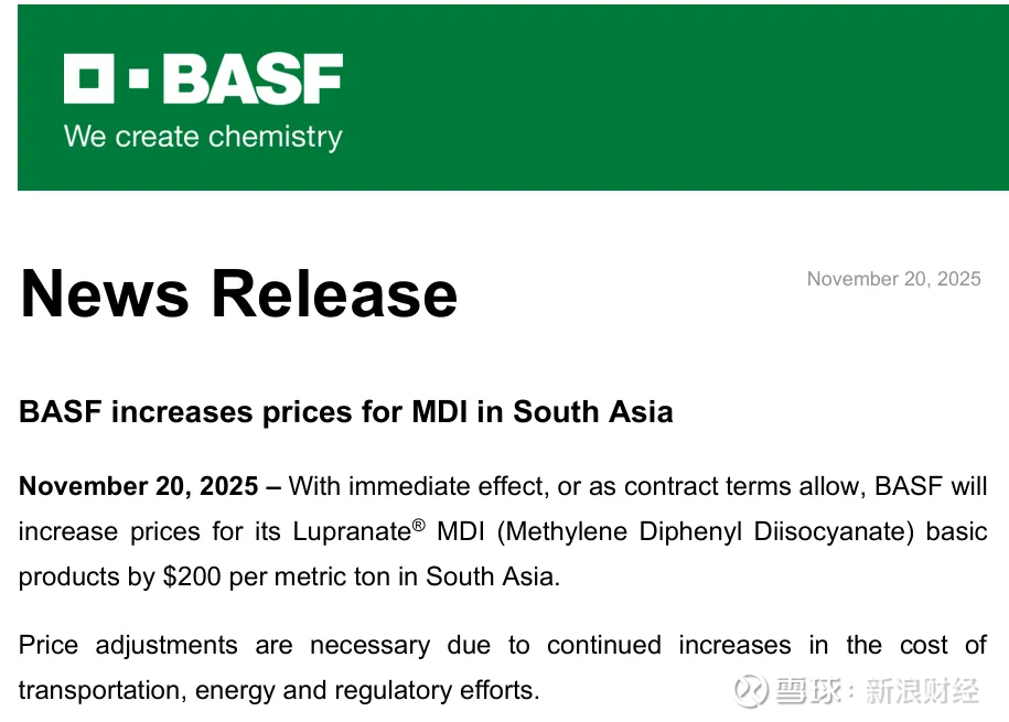 万华化学:11月27日,万华化学宣布,将从2025年12月1日起,上调在东南亚及南亚地区的聚合MDI与纯MDI产品价格,调涨幅度为200美元/吨(约等于人民币1416元/吨),或按既定合同执行。