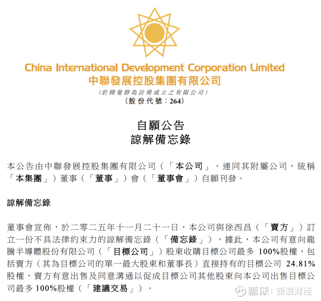 半导体行业再现 “蛇吞象”:主营皮革时装、市值仅 12 亿港元的亏损企业中联发展,拟最高 90 亿港元收购功率半导体领军企业龙腾半导体 100% 股权。