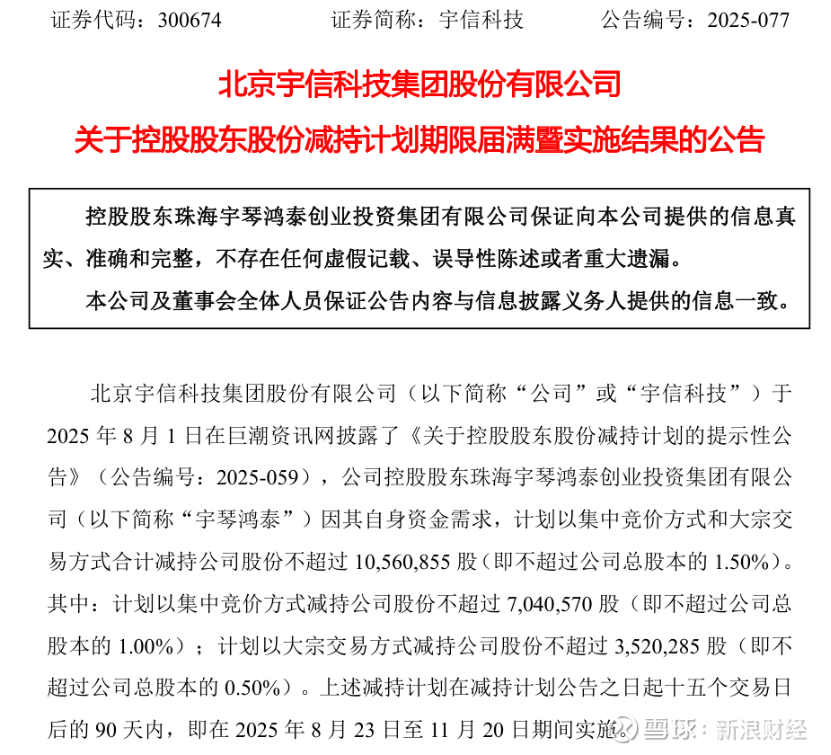 一纸“收官”公告,把聚光灯再次打向洪卫东。11月21日,宇信科技(300674.SZ)公告,控股股东珠海宇琴鸿泰创业投资集团有限公司(以下简称“宇琴鸿泰”)本轮减持计划届满:三个月内,451.52万股、1.03亿元现金落袋。加上2025年6月询价转让的1.93亿元、2023年初大宗减持的1.92亿元,34个月里,宇琴鸿泰已从二级市场“抽水”4.9亿元。
