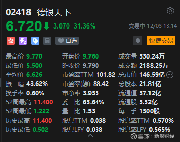 12月3日消息,德银天下盘中暴跌43.82%至5.5港元,股价创10月13日以来新低。截至发文,德银天下跌31.36%,报价6.72港元。