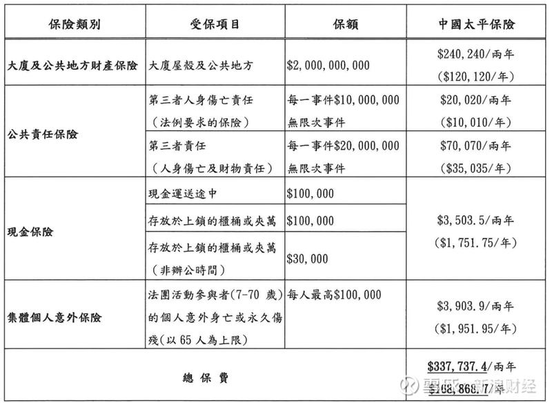 这些保障均由太平香港方面提供,每年保费约为16.89万港元,2年合计保费约33.77万港元。投保期为2025年1月1日至2026年12月31日。