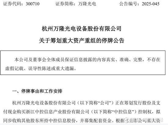 万隆光电(300710)12月3日晚间公告称,公司正在筹划发行股份及支付现金购买浙江中控信息产业股份有限公司(以下简称“中控信息”)控制权,拟同步收购其他股东所持中控信息股份,并募集配套资金。本次交易构成关联交易,经初步测算,本次交易预计构成重大资产重组。经公司申请,公司证券自12月4日(星期四)开市时起开始停牌。