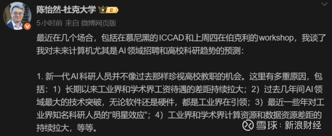 杜克大学陈怡然教授曾提到一点,因为工业界和学术界计算、数据资源差距拉大,AI科研人员不再把高校教职当做目标。