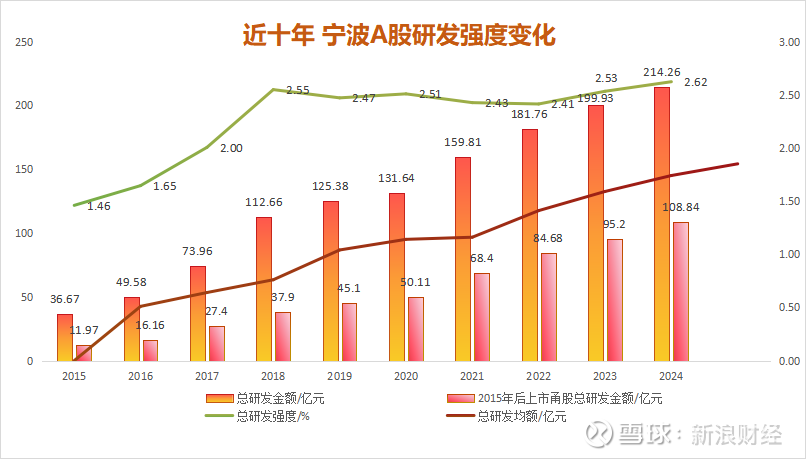 2024年,A股宁波上市公司研发强度均值较2015年提升0.66个百分点至4.52%(剔除金融、零售、基建等未公布研发支出上市甬企)。