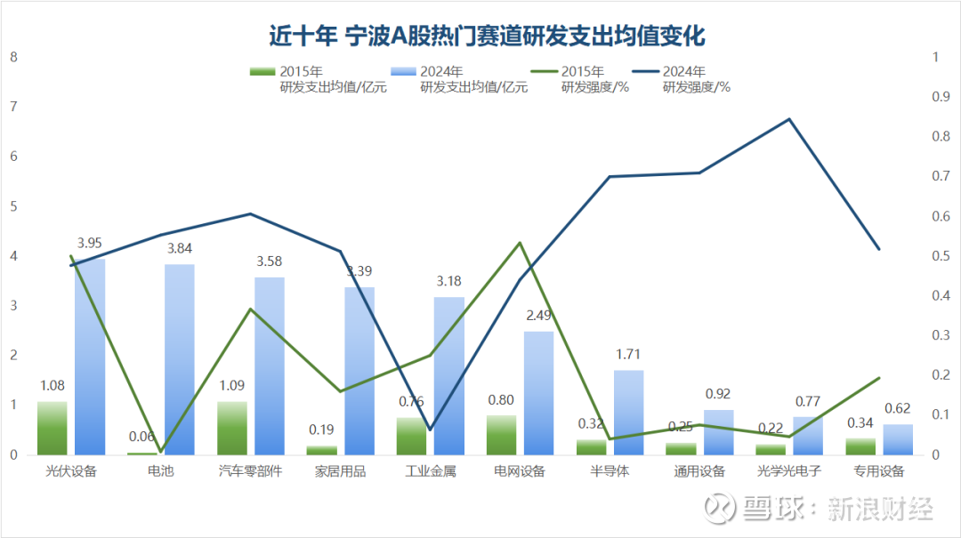 而2024年,研发支出居前的上市甬企主要集中在光伏设备(研发强度3.81%,后同)、电池(4.43%)、汽车零部件(4.85%)、家居用品(4.10%)等领域,研发支出均值均超3亿元。