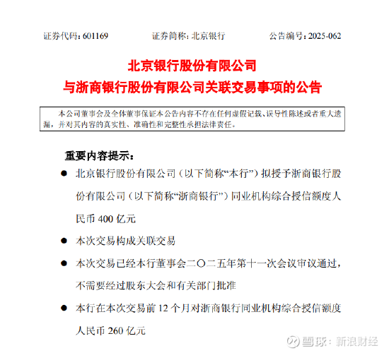 公告显示,上述授信方案已于2025年7月18日经北京银行总行信用审批委员会审议通过,具体业务品种由该行总行信用审批委员会核定,额度有效期2年,自信用审批委员会审批意见表生效之日起生效。由于此次授信额度超过北京银行最近一期经审计资本净额的1%,根据《银行保险机构关联交易管理办法》和《北京银行关联交易管理规定》,该交易构成重大关联交易,经本行内部授权审批程序审查,并经董事会关联交易委员会和独立董事专门会议事前认可及审议通过后,提交董事会审议。2025年12月9日,北京银行董事会二〇二五年第十一次会议审议通过《关于对浙商银行股份有限公司关联授信的议案》,表决结果为全票赞成,本次交易无需经过股