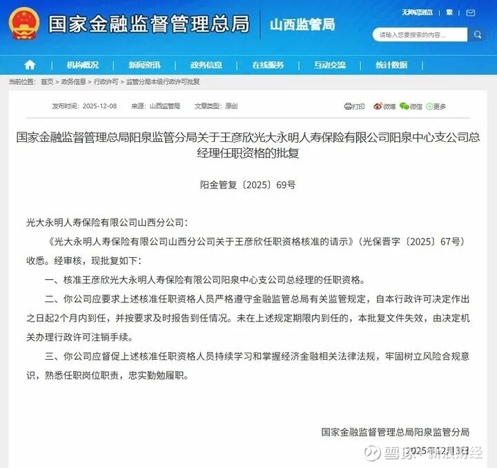 张杨涛获核准担任太平养老保险股份有限公司山西分公司副总经理(主持工作),王彦欣获核准担任光大永明人寿保险有限公司阳泉中心支公司总经理。