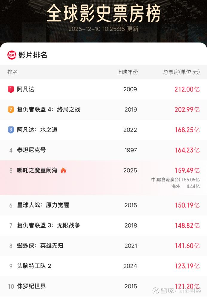 图片来源:猫眼专业版 据猫眼专业版的全球影史票房榜单,排名第一位的是《阿凡达》第一部,总票房212亿元,该片开创了全球3D电影的先河;第二位是《复仇者联盟4:终局之战》,总票房为202.99亿元;第三位是阿凡达第二部,即《阿凡达:水之道》,总票房168.25亿元。