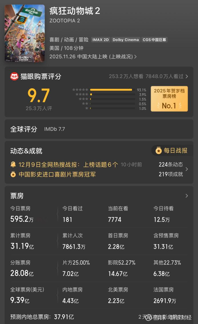 图片来源:猫眼专业版 截至发稿,该片已连续十余日蝉联内地票房日冠,累计票房已超31亿元,成为中国影史进口动画电影的票房冠军,实现了票房与口碑的“双引爆”。猫眼专业版预测数据显示,该片内地总票房或达37.91亿元。