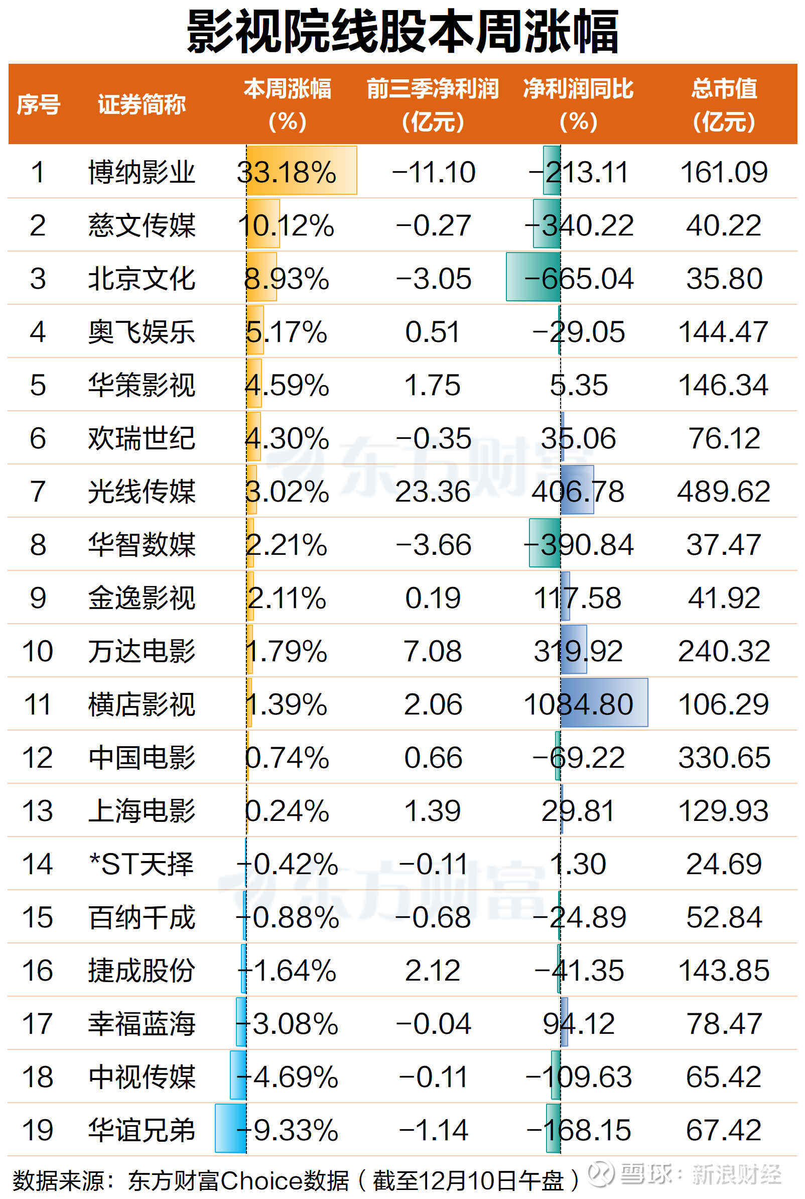 12月10日,A股影视院线股表现强势。截至早间收盘,博纳影业涨停,股价已3连板,北京文化涨超3%,中国电影、光线传媒涨超2%,万达电影、上海电影、金逸影视、奥飞娱乐横店影视等跟涨。