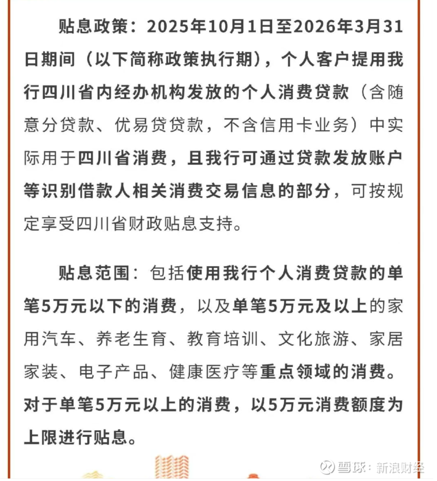 四川则以“短期聚焦、精准适度”为特色,以成都银行为例:一是执行期限相对集中,设定为2025年10月1日至2026年3月31日,聚焦年末及年初消费旺季;二是地域限制明确,要求贷款资金必须用于四川省内消费,强化对本地市场的刺激;三是贴息力度适中,累计贴息上限1500元(对应符合条件的累积消费金额30万元),其中5万元以下贷款累计贴息上限500元(对应符合条件的累积消费金额10万元),贴合地方财政承受能力。
