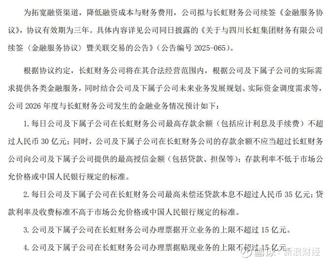 公司及下属子公司在长虹财务公司办理票据开立业务的上限不超过15亿元。