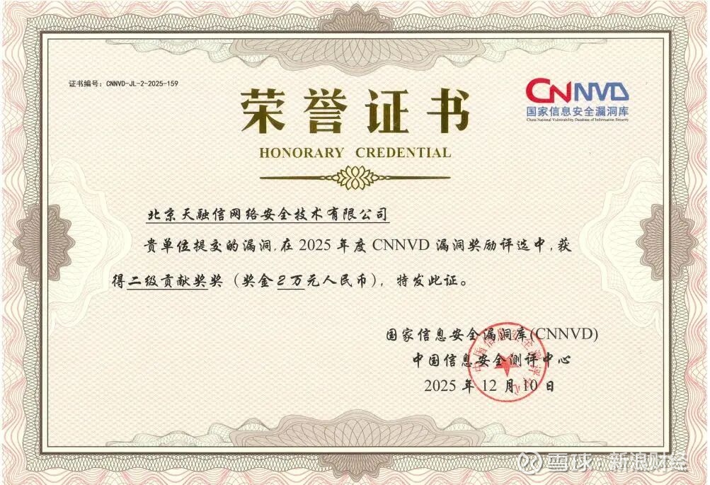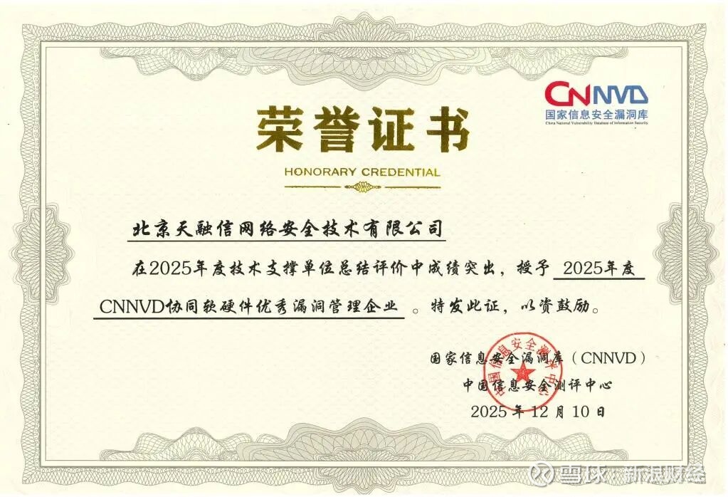 在同期举办的网络漏洞治理生态大会上,天融信一次性揽获“2025年度优秀技术支撑单位”“2025年度CNNVD协同软硬件优秀漏洞管理企业”“2025年度CNNVD漏洞奖励‘二级贡献奖’”三项荣誉。