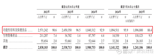一方面,是传统支柱性业务增长乏力。新诺威作为全球最大咖啡因供应商,以咖啡因、无水葡糖糖为代表的功能性原料及保健食品业务,是公司的业绩支柱。2022—2024年,该业务贡献收入占比分别高达90.6%、96.5%、92.9%。