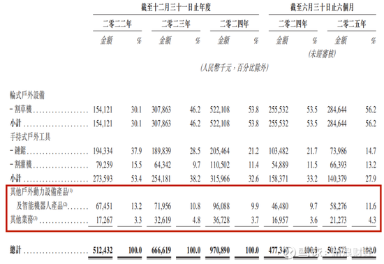 2024年及2025年上半年,公司2.52亿元及1.49亿元的毛利中,其他户外动力设备产品及智能机器人产品占比也分别有9.45%、11.11%。