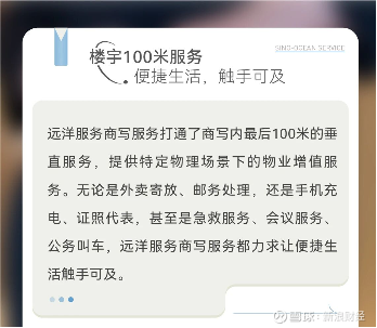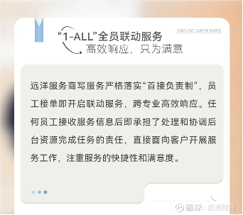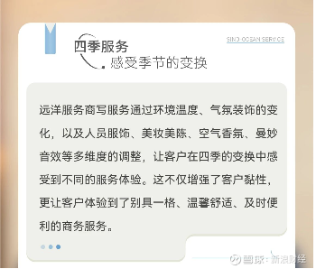 远洋服务商写板块围绕客户全方位需求,构建“四季服务体系”,以自然时节为脉络,通过多感官维度的环境营造与服务设计,持续提升楼宇空间品质与服务温度。该体系深度融合“楼宇100米”与“1-ALL全员联动”两大特色机制:前者聚焦办公生态末端,集成行政、配套与应急服务,实现便捷触达;后者通过首接负责与跨部门协作,确保客