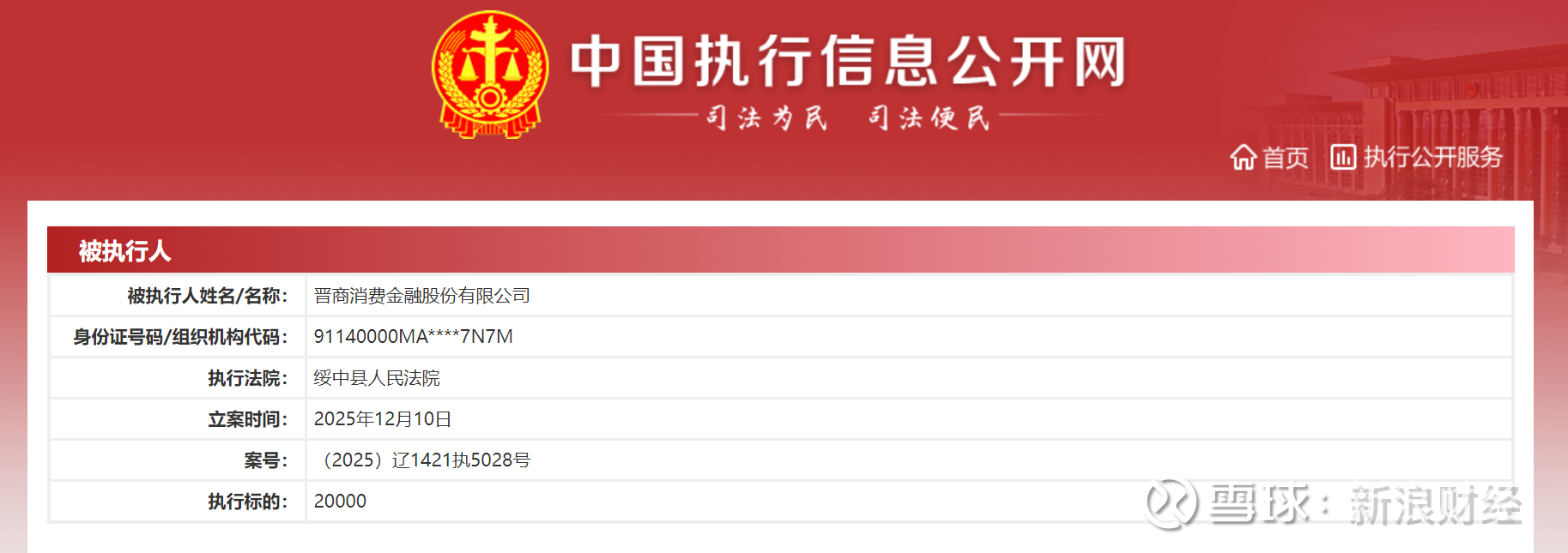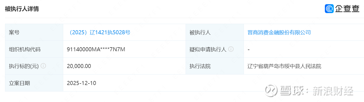 新京报贝壳财经讯(记者黄鑫宇)12月15日,中国执行信息公开网及企查查共同显示,晋商消费金融股份有限公司(即晋商消费金融)成为被执行人,执行法院为辽宁省葫芦岛市绥中县人民法院,立案时间为2025年12月10日,执行标的为20000元。