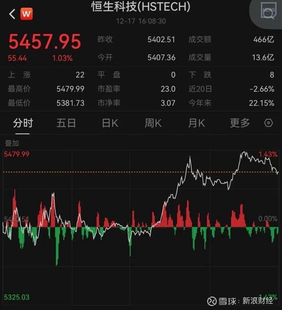 12月17日,港股午后三大指数快速拉升回暖。截至收盘,恒生指数上涨0.92%,恒生科技指数上涨1.03%,恒生国企指数上涨0.98%。