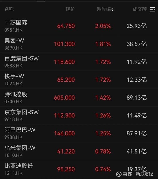 大型科技股普遍回暖,美团、百度、快手、腾讯等分别上涨1.81%、1.72%、1.72%、1.42%。